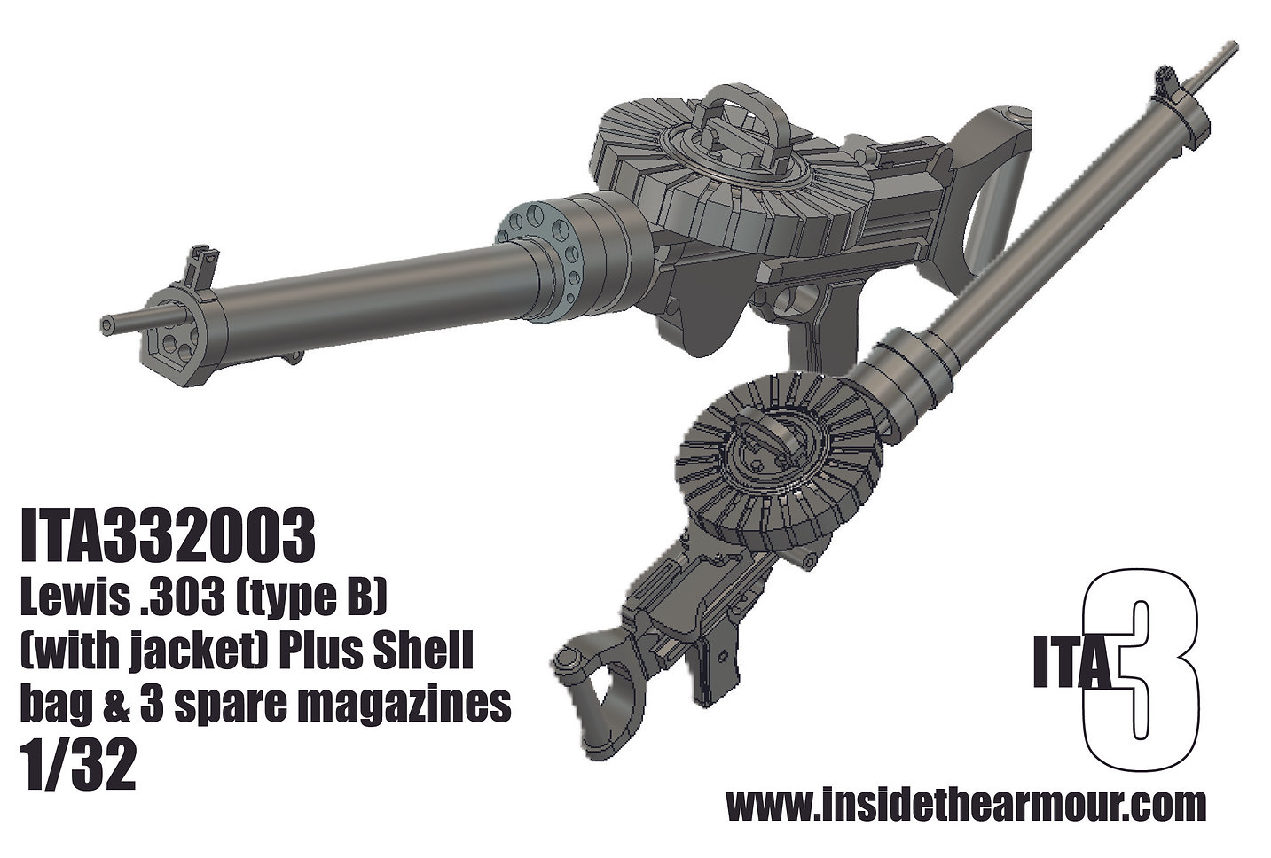 A highly detailed 1/32 Lewis 303 (aircraft Type 2) with cooling sleeve, optional shell bag and three spare magazines to ensure your stowed mags match the one on the gun